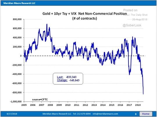 To that end, check this chart from Meridian Macro Research. It shows the combined short positions of Speculators in Comex gold, 10-year U.S. treasury bonds and the stock market volatility index called the VIX. To be short any of these three would indicate that the Speculators expect: