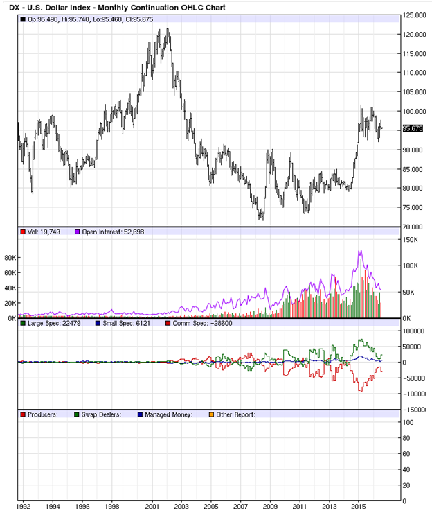 The following chart from 1992 shows that Open Interest is at a pivotal point, which may well catapult the US$ to its 2001 high of 122. Of course, this assumes that the obvious Bull Flag finally triggers – and subsequently moves the US dollar upward.