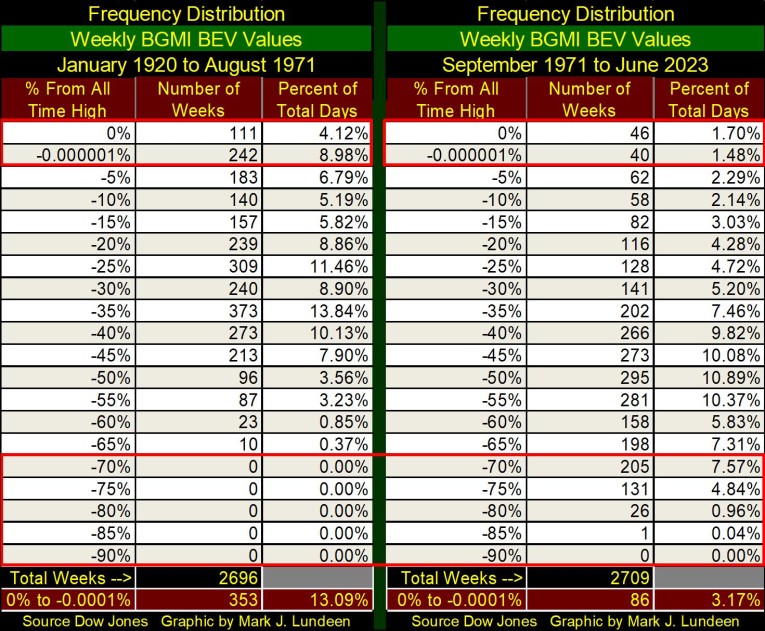 From January 1920 to August 1971 (Left Table), the totals from these two rows equaled 13.1% of the total weekly closings for the BGMI during these fifty-one years, or the BGMI was in a bull market for 13.1% of the time during this half century.