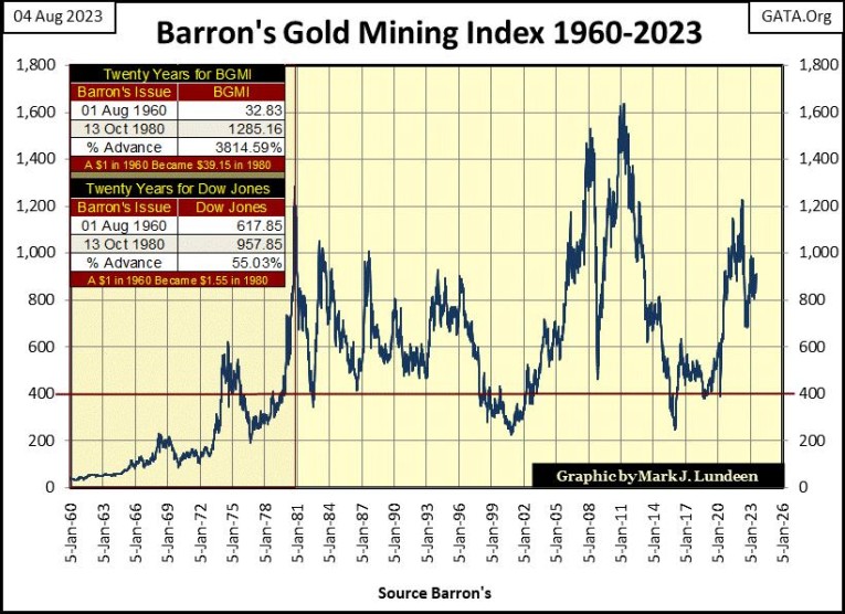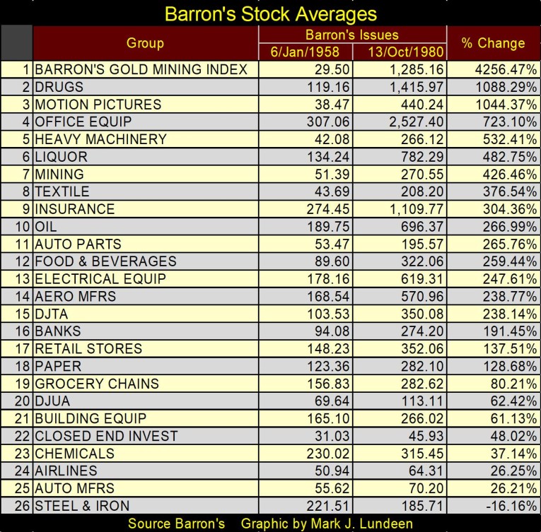 Over at the NYSE, what is, and what is not beloved by both the pubic and “market experts” changes with time, and the trends in interest rates and bond yields. Way back into the late 1950s, when bond yields and interest rates were single digits, to 1980 when rates increased to double-digits, the gold miners were the top group in the stock market, as seen in the Barron’s Stock Averages table below. During these twenty-two years of rising rates and yields in the debt market, nothing else came close to the advances seen by the gold miners.