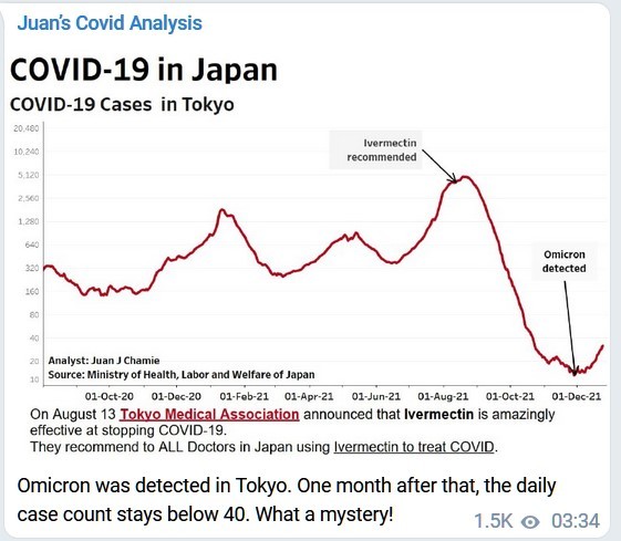 The chart below shows the number of Covid cases in Japan since October 2020. After two earlier medium-sized peaks in the number of infections, Japan saw an increase in the number of cases starting in July 2021 that reached a new higher peak by August. This delta wave hit a high of 26 184 new daily cases for Japan on 22 August, less than 2 weeks after doctors were authorised to employ Ivermectin for both treatment and prevention of infection. As shown in the chart below, when Omicron erupted in Japan, there was an immediate increase in the number of cases in Tokyo, yet off such a low base to remain below 40 per day, according to the Japanese health ministry.