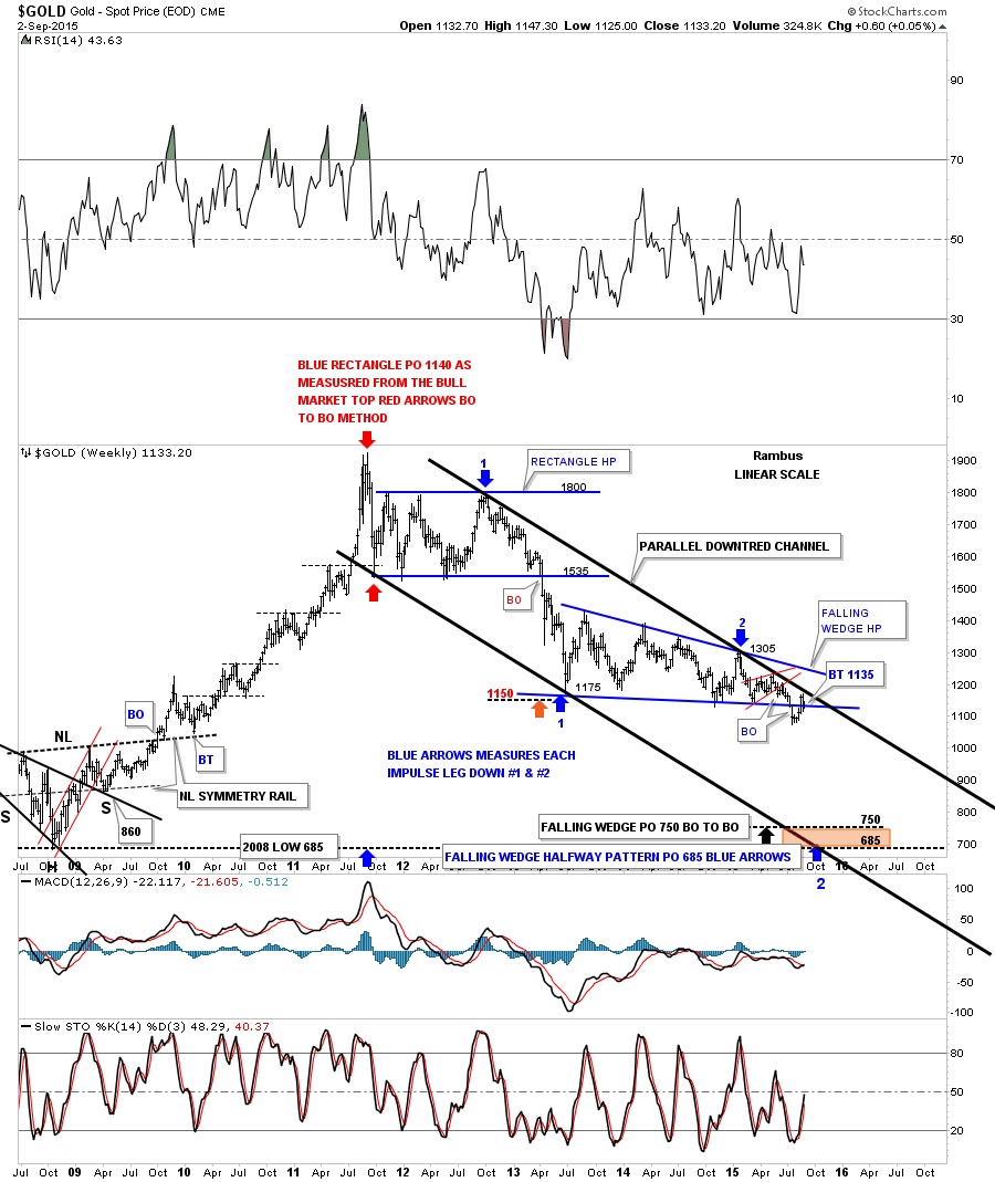 If I could show a perfect setup to end this four year bear market and keep the secular bull market intact I would shows this long term weekly chart for gold. This bear market would be one big consolidation pattern which would be a bullish expanding falling wedge consolidation pattern. The black arrows shows how I would like to see the rest of this pattern develop. Also notice the black bullish expanding falling wedge that marked the low during the 2008 crash. That was one hell of a rally once the top rail of the black expanding falling wedge gave way. Each low in each of the smaller red consolidation patterns were all right at 6 months from low to low. The 65 wma has done a good job of showing support during the bull market years and resistance during the bear market years.