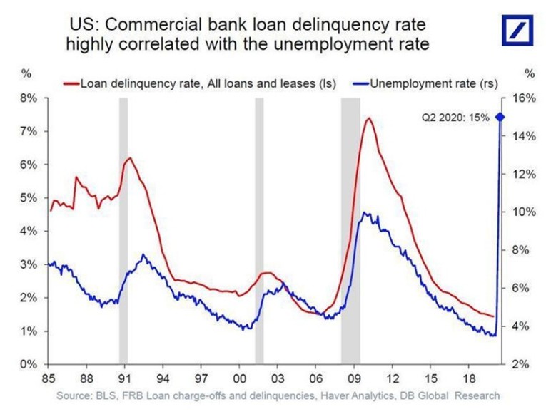 We must also remember that bad debts in the financial system are going up by the minute with most borrowers under severe financial pressure. Just look at the chart below how bad debts follow unemployment. The banks haven’t reported this yet but we will see it in the next couple of quarters.