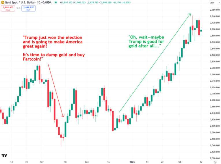 Yet, how wrong they were! Gold not only erased its election-related losses but has surged to a new record—now roughly $100 above its pre-election high in late October—while silver is close behind.