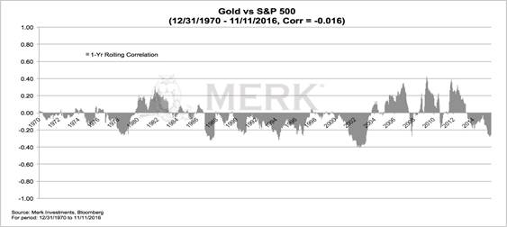 Since 1971, the price of gold has had a zero correlation to the S&P 500 index based on our analysis (-0.016 based on daily returns, to be precise). From that point of view, gold may be a long-term diversifier. That said, there are times when the correlation is positive; others when it is negative: