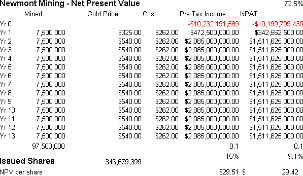 The valuation assumes that Newmont has 346.7 million shares in issue, its mines will produce at the rate of 7.5 million ounces a year at a cost of $262 per ounce of getting the gold out of the ground. It also assumes a required return on investment of 15% p.a. based on PRE TAX earnings and 9% p.a. based on AFTER (27.5%) TAX earnings. (And it also ignores the profit "cap" of Newmont's forward book)