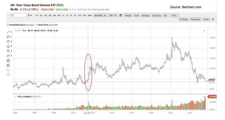 In fact, bond demand (as measured by the TLT) actually rose by 25-30% after the 2011 downgrade!