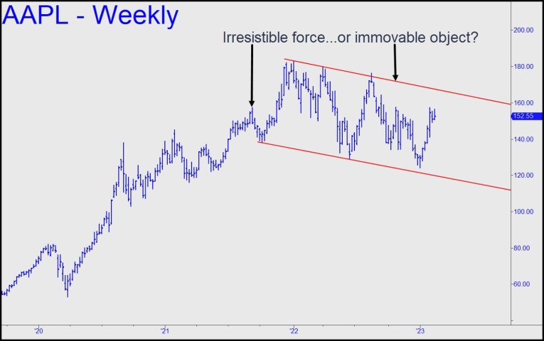 However, any time a chart speaks so clearly, alarm bells should go off. For what looks like a simple picture is often more devious and complex than a three-way showdown in a spaghetti western. Were it otherwise, every chartist would retire rich at 40. So whenever we look at a graph that seems to spell everything out for us, realize that the stock is calculating how to screw everyone. In this case there would appear to be three distinctly different possibilities: 1) the rally fails right here or perhaps somewhat above, giving way to the ruinous implosion of a $2.5 trillion company; 2) heedless buyers impale the trendline within the next month or so , launching AAPL into the firmament; or 3) the stock wanders in the desert for 40 years, or at least until no one cares about the channel any longer.