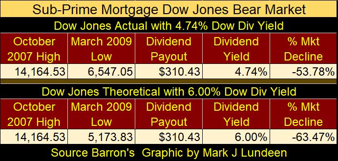 The point of all this is; for a very long time the Dow Jones has wanted to deflate its valuation to where it will yield something above 6%. Likely something much more than just 6%. However, the idiots at the FOMC refuse to allow that, as a 6% Dow Jones yield would be a historic bear market. How big a bear market? See the table below.