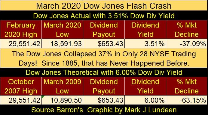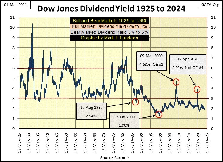 The next time the Dow Jones Dividend Yield increased to above 3% was during the March 2020 Flash Crash, where the Dow Jones yield spiked to a whopping 3.51% (😊), forcing FOMC Primate Idiot Powell to flush trillions of dollars of inflation into the market in a matter of two or three weeks during his Not QE#4, to prevent a devastating collapse in the financial system; having the Dow Jones yield something over 6%.