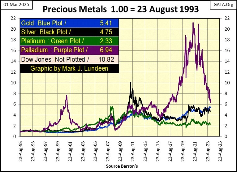 Here is a chart plotting the indexed values of various precious metals going back to 1993. From 2016 to 2021, palladium (Purple Plot) was outperforming the stock market. Since then, it has crashed by 70% since its highs of 2021.