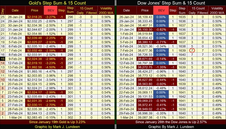 For the Dow Jones on its side of the step sum table, things are looking very good. Every day since January 26th the Dow closed in scoring position, or even more frequently, at a BEV Zero. For us gold bulls, we’d like seeing daily volatility begin to rise. But for the bulls now running wild and free on Wall Street, seeing daily volatility decline from 0.50% at the end of January, down to 0.49% is exactly what they like to see, as bull markets on Wall Street are actually quiet markets.