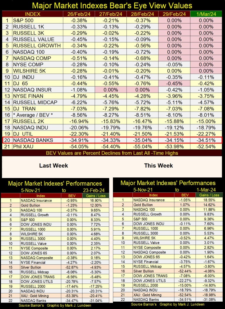 The NASDAQ Banking Index remains at #20 in the table below, with a BEV in the mid -30s%. It’s not a good sign for the future that money is freely flowing into these other indexes seen in the table, as it avoids the banks, way down at #20.
