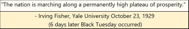 The hidden dangers of a market top have lured the best minds of the market too, such as Irving Fisher, of Yale University in October 1929. Professor Fisher in the 1920s was one of the most famous economists in the world. Six days after the following quote was published, the Dow Jones began a historic crash that didn’t bottom until July 1932.