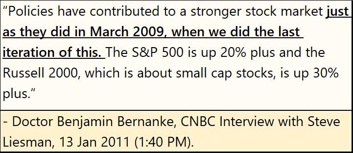 FOMC Primate Idiot Bernanke’s response to the above deflation, to prevent the Dow Jones from yielding 6%, was to institute his first of three Quantitative Easings, his QE#1, to reflate market valuations back to, and then above where they were in October 2007.