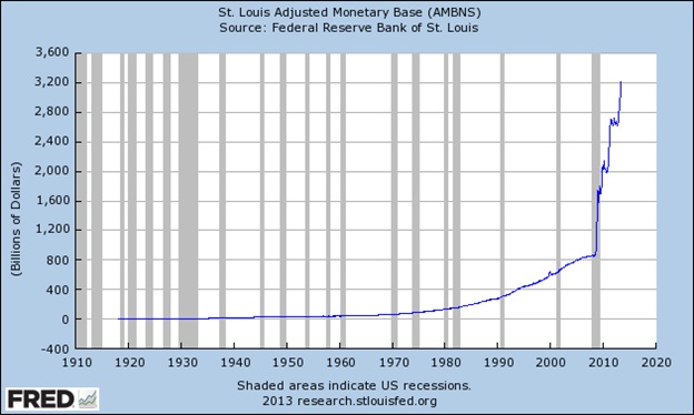 We are already past the point of no return in our hyperinflation spiral. Proof of that is supplied every time the chart of the United States’ adjusted monetary base is flashed before readers’ eyes: an extreme exponential function (of the world’s “reserve currency”), which mathematically epitomizes the words “out of control.”