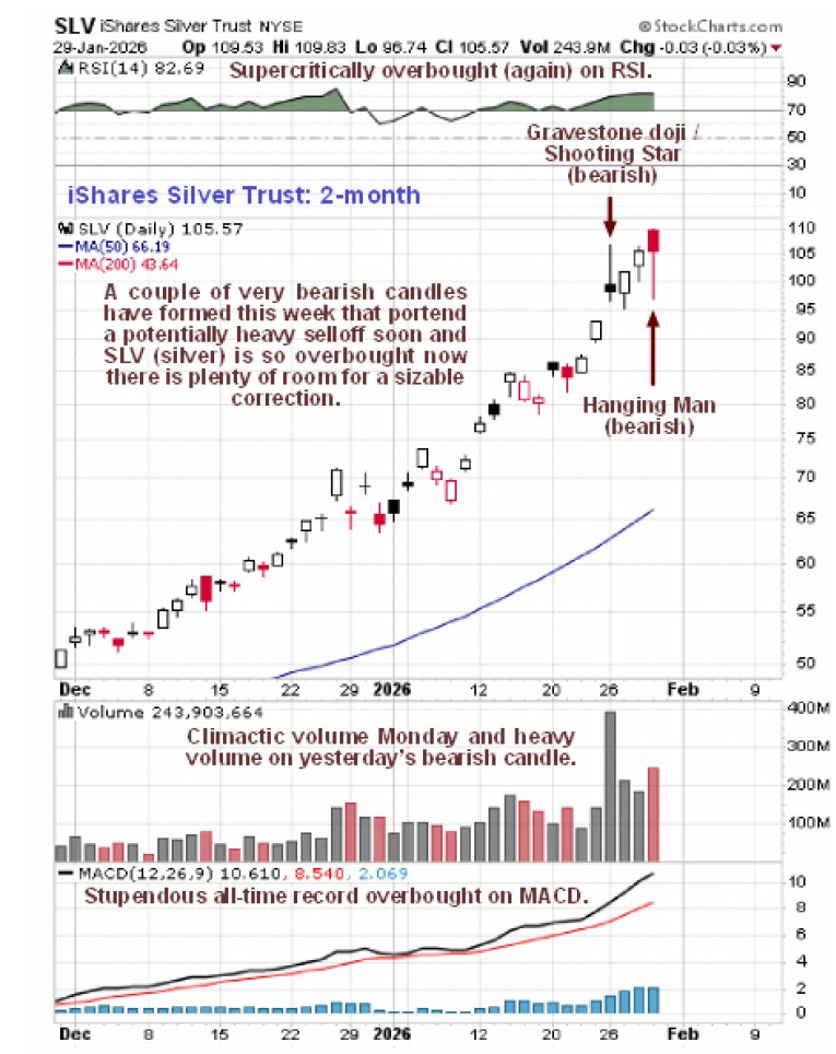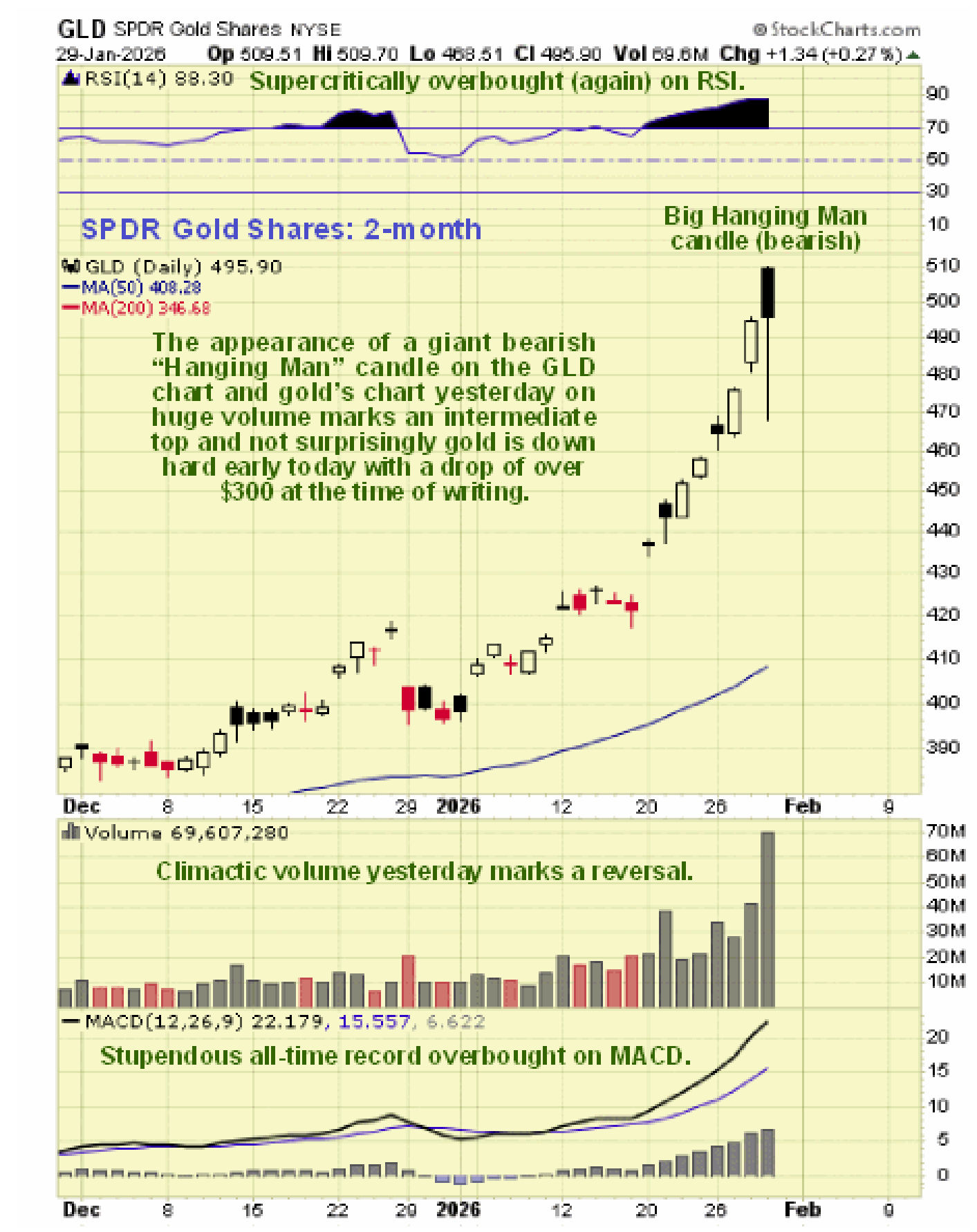 Meanwhile, gold proxy GLD put in a gigantic wide range “Hanging Man” candle yesterday on huge volume as we can see on its 2-month chart below, thus confirming the solidifying bearish picture emerging in silver. Hence the crushing drop in gold this morning after its near vertical runup this month.