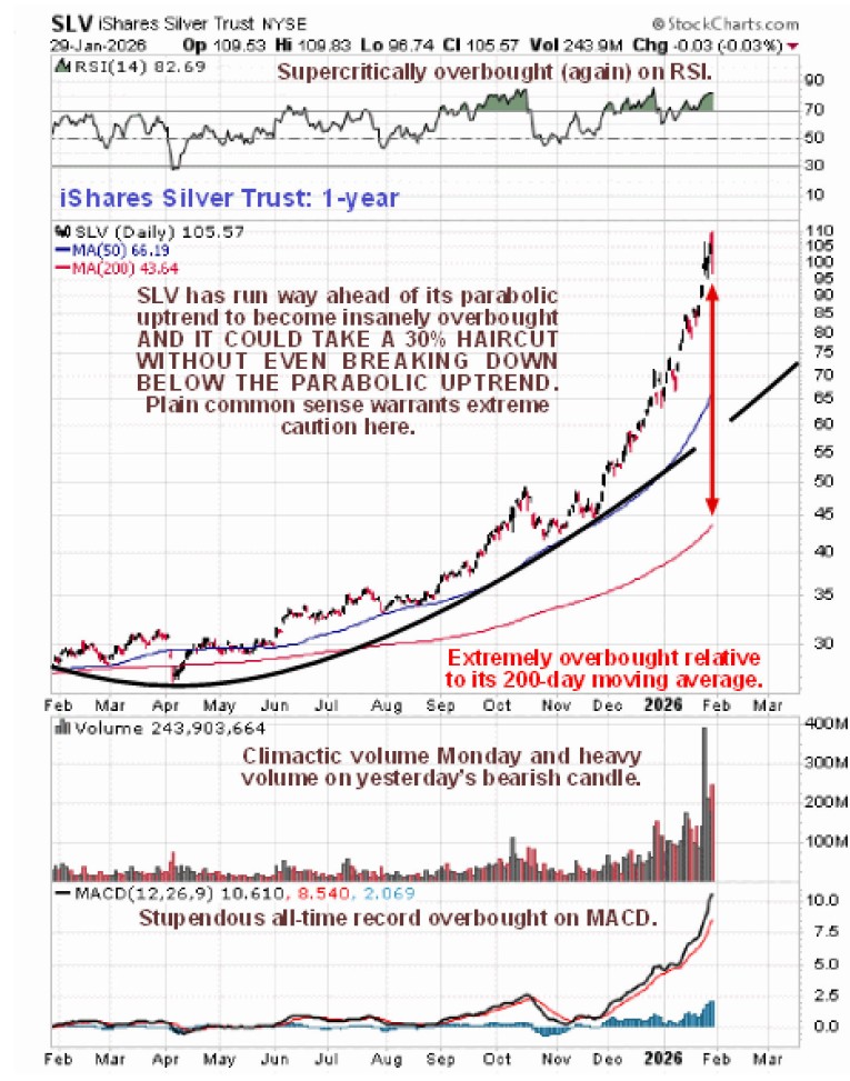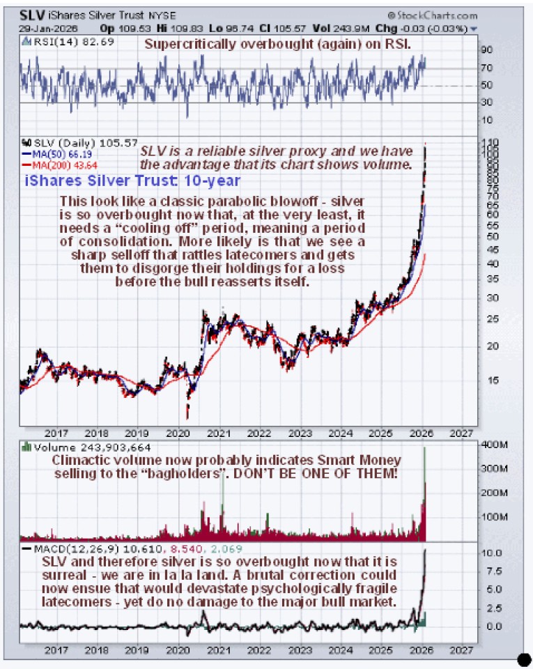 The chart for silver proxy SLV, also for 1-year, is useful as it shows volume and thus enables us to see the climactic top volume last Monday which was a reason for the warning being issued on Tuesday. …