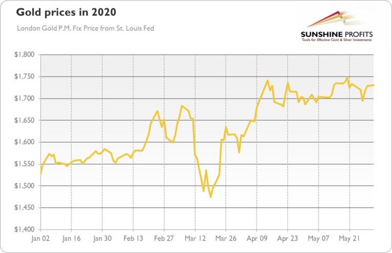 What do the riots across the US imply for the country and the gold market? Well, the civil unrest should be positive for the yellow metal. There are three reasons for this. The first and most obvious is that geopolitical risks concerning the US directly could spur the safe-haven demand for gold. We are, of course, fully aware that geopolitical factors rather do not drive the long-term trend in the gold prices, but they help in the short-term. As the chart below shows, the yellow metal has been consolidating recently around $1,700, perhaps preparing for further upward move.