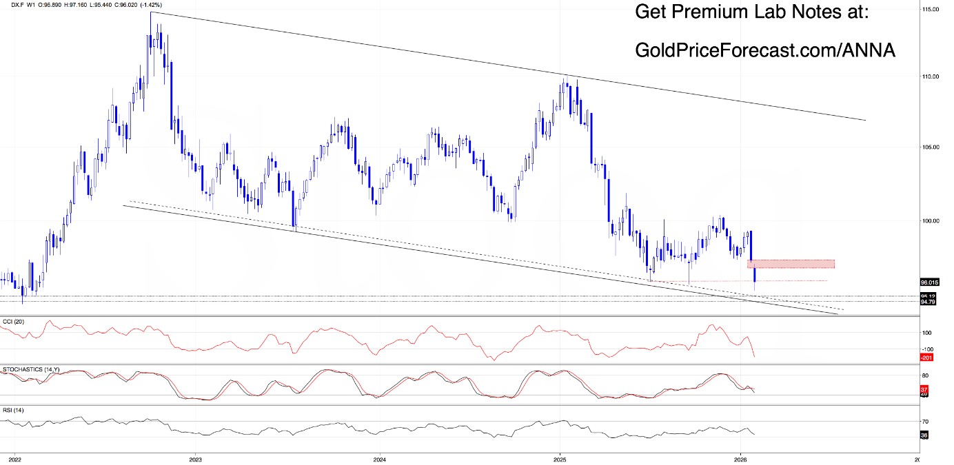 From today’s perspective, we see that bears once again had zero trouble delivering on our bearish scenario. The USD Index was pushed to its lowest level since February 2022, printing a fresh multi-year low at 95.44