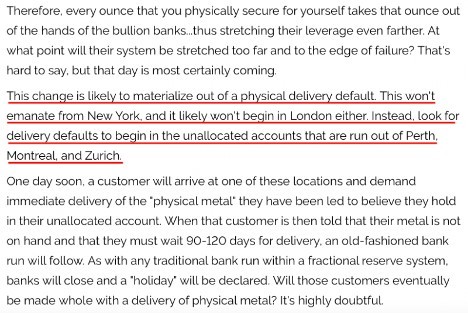 Just as important, however, is the continued demand of immediate delivery from unallocated accounts. First of all, if you personally hold metal in an unallocated account, get it out NOW. The last thing you want is to be at the back of the line with all of the other fools caught flat-footed and left wanting.