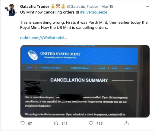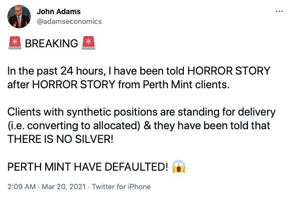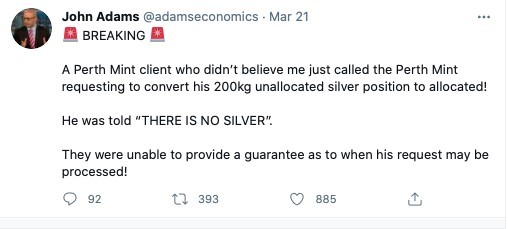 Remember, an unallocated and fractional reserve system is precisely how your local fiat bank runs its business. All deposits are not held in the vault. Instead, the bank may hold 10% or so of its assets for "deposit demands" and it loans out the rest. This system profits the bank, and it works just fine—until it doesn't, and the day comes when multiple customers show up at the same time and demand their cash. In the old days, it was called a "bank run". In 2021, it's called a #SilverSqueeze. In the clip below, don't think of George Bailey. Instead, think of R.G. Hayes or Bart Kitner.