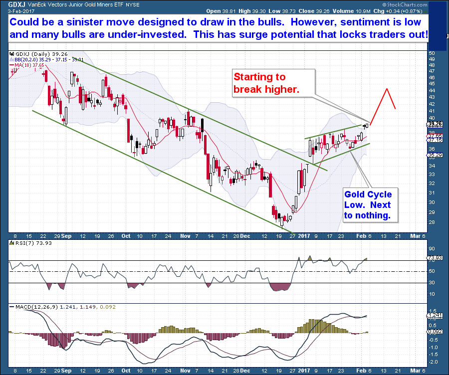 Always look at the evidence as it stands, meaning the recent price action and what has occurred, not what might occur. Look at the chart of precious metal miners below, for example. Sure, this could be a sinister move designed to draw in the bulls. But that goes to my point above; we cannot sit back and look at the worst case scenario, that’s what defining a stop point is designed to protect us against. The chart below, with the evidence seen in gold/silver price, tell me that we have a great setup ahead.
