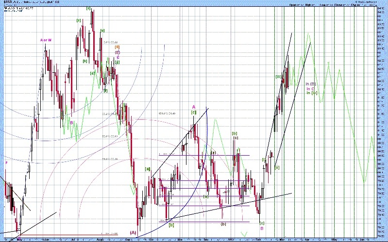 The short-term Elliott Wave count of the US Dollar Index is shown below, with wave [iv].C.(B) thought to be forming at present. Expect wave [iv] to last another 5-7 trading days before one final push higher in wave [v]. Wave (A) that ended in September 2012 was thought to be an elongated zigzag. Wave (B) has formed an elongated flat (3-3-5), which generally occurs as an entire leg of a triangle or as a segment of a leg within a triangle (most likely a segment, as wave (A) was an elongated zigzag, which also generally forms in triangular structures). When wave (B) completes, wave (C) is likely to be an impulsive move down to around 73-74 sometime between September and October 2013. Wave [E] seen 25% from the left hand side terminated a triangle we followed since mid 2008. The move after is part of another Elliott Wave pattern thought to be an expanding triangle (currently working on wave[A]). If wave (B).[A] drops to 73-74, then it will complete the first leg of an expanding triangle. The Contracting Fibonacci Spiral has a top in the broad stock market indices around May 21st, 2013, which requires a subsequent sharp move down sometime shortly after (most likely to start in late 2013/early 2014). In theory, this should be accompanied by a sharp move up in the US Dollar Index as debt payment demands put pressure on the upward move.