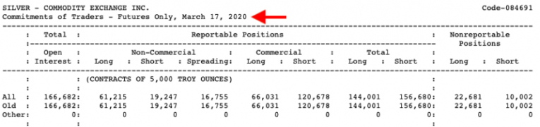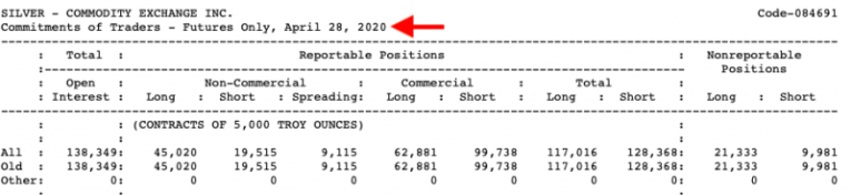 This same phenomenon is being observed in COMEX Digital Silver, too. Shown below is the Commitment of Traders report from mid-January, with total COMEX silver open interest near all-time highs but with price at just $17.90. (Note this is the simplified "legacy" report of Large Speculators and Commercials, not the disaggregated report we showed for COMEX gold.)