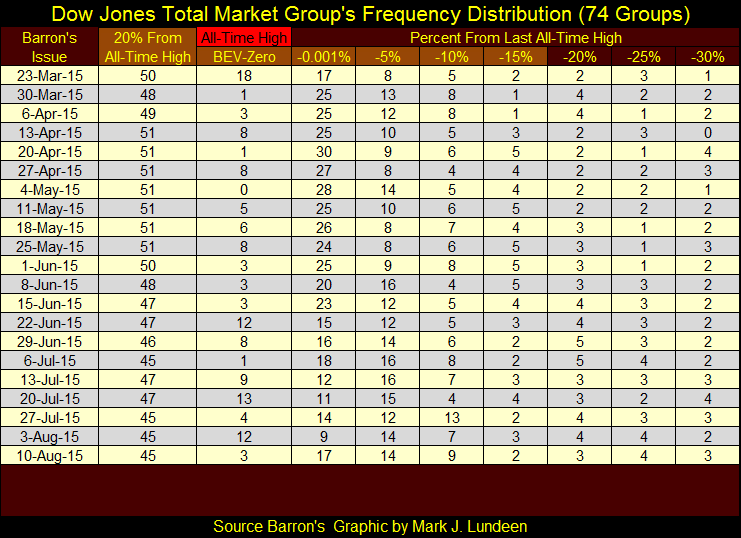 Below is the frequency breakdown from the credit crisis. In Barron’s 09 March 2009 issue only 5 groups were within -30% to -34.999% from their last all-time high, meaning 69 of 74 groups had declined 35% or more.