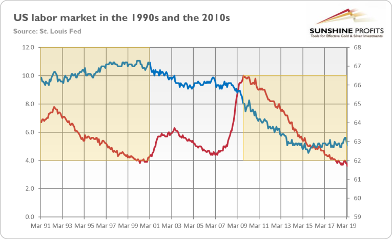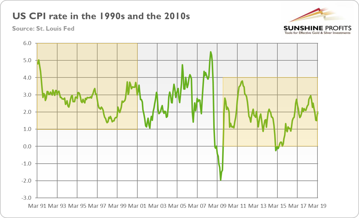 Let’s compare now inflation in the 1990s and currently. As the chart below shows, inflation rate has been recently significantly lower – more than 1 percentage point, on average – than in the 1990s. Then, there was a disinflation, so gold struggled. Since the Great Recession, inflation rate stabilized, but at stubbornly low level.