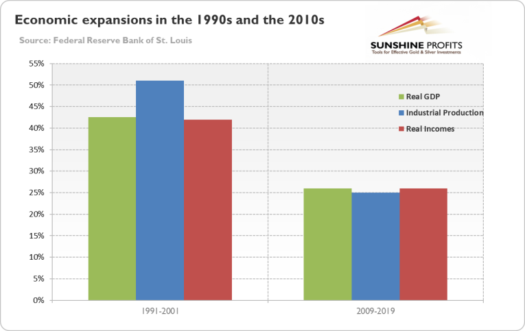 As one can see in the chart above, although both expansions lasted the same time – 120 months – the boom of the 1990s was much stronger. Indeed, the real GDP and real income soared more than 40 percent, while industrial production surged more than 50 percent over the decade. In contrast, all three measures increased just about 25 percent in the 2010s. It means that the current expansion is much weaker. In part this is completely understandable, because as time goes by and economy advances it is harder for maintaining a fast growth rate. But still the sluggish growth is disturbing, with the exception of the gold bulls who should welcome it.
