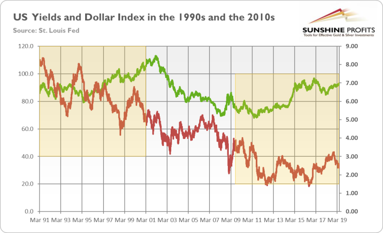 What does it all mean for the gold market? Well, the macroeconomic environment in the 1990s was much worse for the yellow metal. The GDP was rising quickly, while the labor market was strengthening. Inflation was decreasing, while the US dollar was strong and appreciating in the second half of the 1990s. The US fiscal policy was tightening, while the Fed was lifting the Federal Funds Rate in 1993-95, as one can see in the chart below.