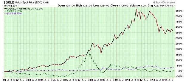 The US$ price of gold has soared +377% from 2001 to date. That’s a compound annual growth rate (CAGR) equal to 13.4%. Contrast gold’s monumental appreciation with the pathetic performance of the Shanghai Stock Exchange Index and the miserly return of US Treasuries.