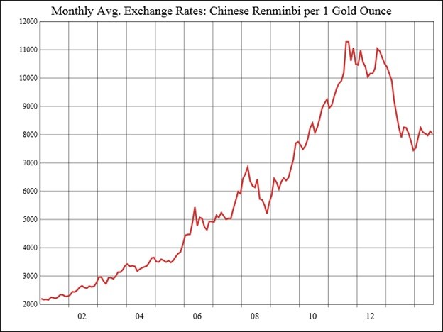 Since 200 the Yuan (Renminbi) price of gold sports a 10.6% CAGR.