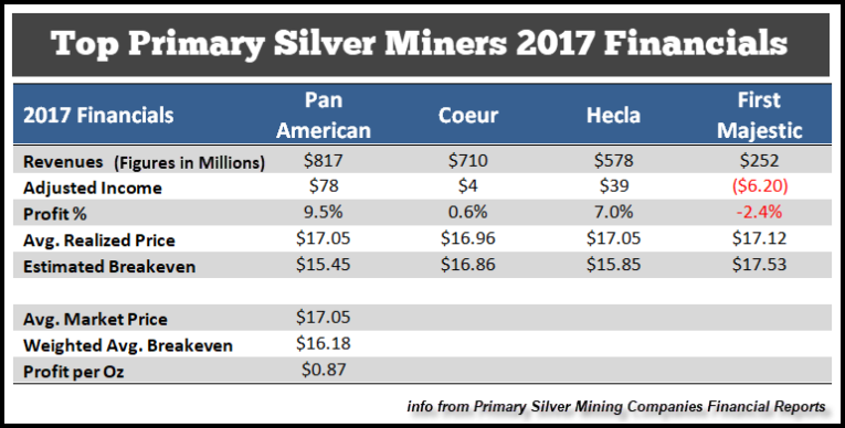 In the video, I include two tables on the top primary gold and silver miners cost of production. Below is the chart for the top primary silver miners 2017 Financials: