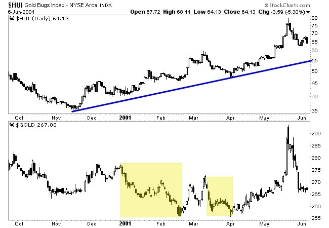 The chart below shows the action in the HUI and Gold during the 2000-2001 bottom. The HUI bottomed in November while Gold formed a double bottom in February and April. The HUI barely corrected when Gold declined to its first bottom. The HUI did decline nearly 20% before the April bottom in Gold but that was after it rebounded 70% in only four months. Moreover, the HUI exploded after Gold’s final bottom in April.