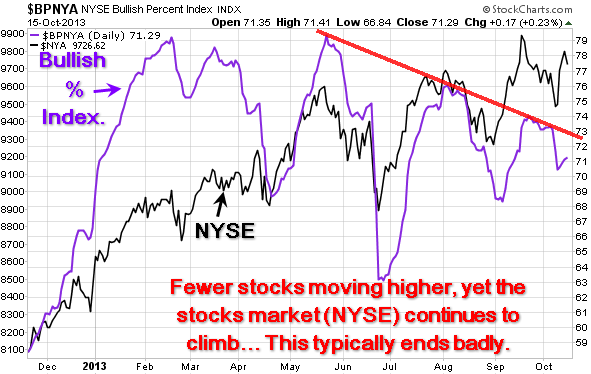 I always prefer to watch and analyze the NYSE as it’s the big board where all the HUGE money is flowing from traders and investors. The chart below clearly shows that less stocks are moving higher as seen with the purple bullish percent index line. With less stocks making new highs, yet the stock market continues to climb this is a warning sign that this bull market is slowly running out of steam.