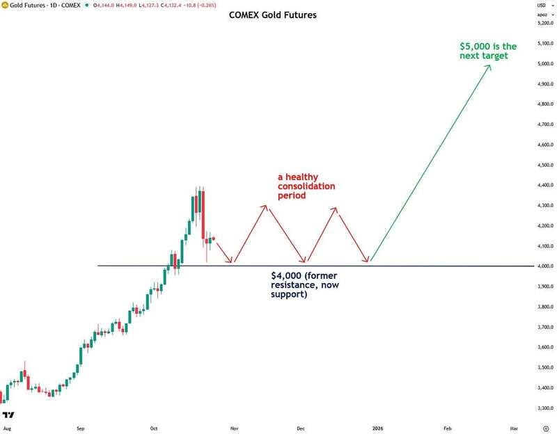 My theory, though not a hard prediction, is that gold’s consolidation will occur above the new $4,000 floor. I expect it to fluctuate around this level for some time, possibly re-testing $4,000 several times as it works off its overbought condition. This consolidation should help gold conserve and build energy for its next move higher, which I expect will take it to $5,000 in 2026.