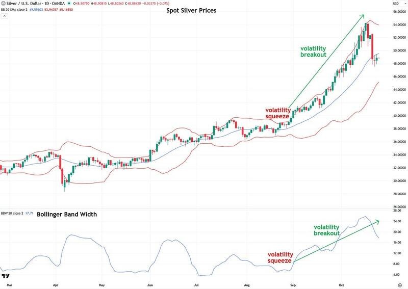 The volatility squeeze and breakout are also clearly visible in the chart of silver: