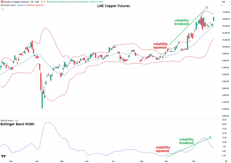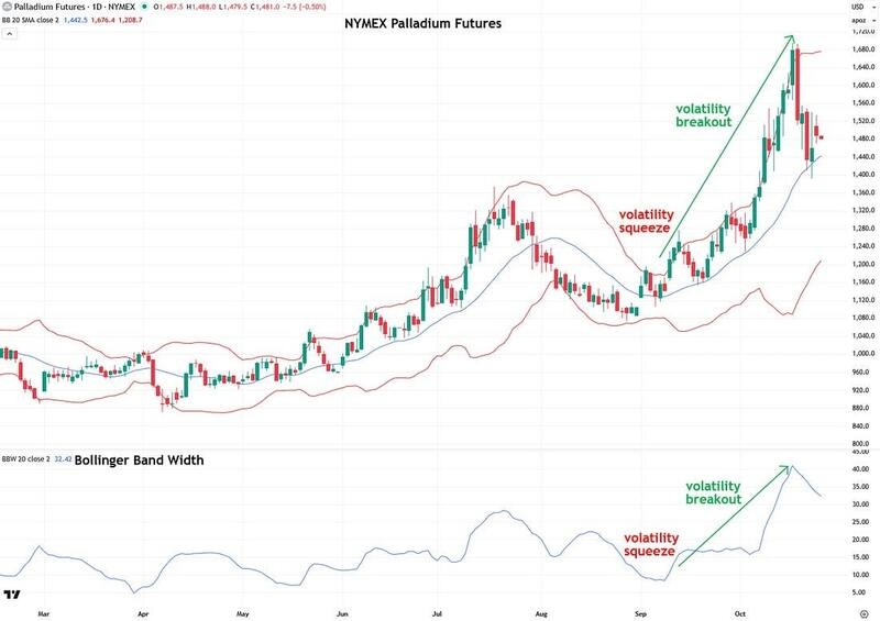 Returning to the platinum example below, from March to May, the metal entered a clear volatility squeeze, visible in the narrowing Bollinger Bands and confirmed by the Bollinger Band Width indicator beneath the chart. During this period, traders grew bored and shifted their attention to more active markets.