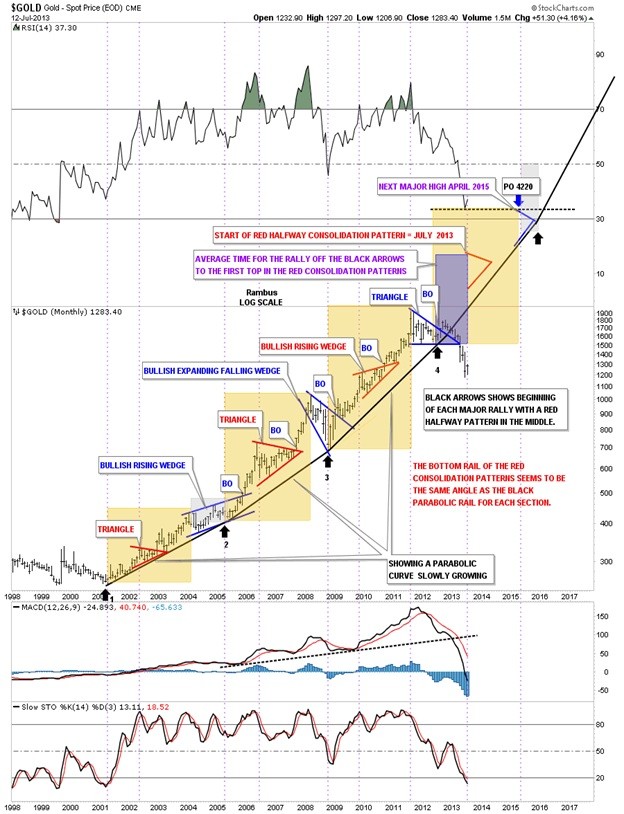 It was only a week or two after I posted that article that I began to see some things which you don't want to see when an impulse leg begins. The breakout of the little triangle kept stalling and failed to move out like all the other impulse legs did. Below is one of the charts that I used in the article, All Hail the Queen, that shows one of the most beautiful bull markets that a chartists could ever chart. As you can see each consolidation pattern broke out to the upside in an impulse move followed by another consolidation pattern. Note the last triangle at the top of the chart. At the time I thought this was going to be just another consolidation pattern followed by an impulse leg up just like all the rest. As you can see the top blue triangle did in fact breakout to the upside but there was no follow through. The longer it took for gold to make up its mind the more it began to look like a false breakout. I kept waiting for the backtest and then the move higher but the price action just drifted slowly down not creating any hysteria.