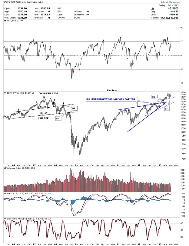 While gold was topping out in the fall of 2011 the SPX was just starting to build out a bullish rising wedge pattern that would lead to new all-time highs. All the experts said this was still a secular bear market in the SPX and that we would see another crash and burn scenario like in 2000 and 2008. Again, if you just follow the price action you don't have to worry about what all the experts are saying. You can see with your own two eyes what is happening. Below is a weekly chart for the SPX that shows the breakout and backtests of the bullish rising wedge. The SPX is right on the verge of making a new all-time high regardless of what is happening in the economy. It doesn't make any difference what the experts are saying, just look at the price action. That is the truth.