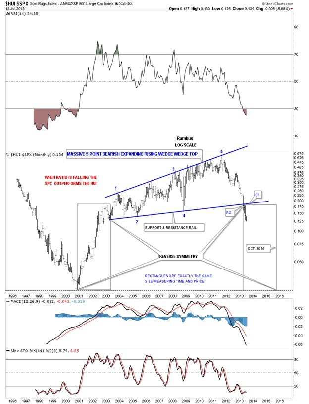 This next chart will answer any questions you may have on why the precious metals complex is in a bear market. If you are still holding your precious metals stocks hoping the bottom is in place and the next leg up is about to take off, this weekly ratio chart comparing the HUI to the SPX may give you a reason for concern. As you can see the HUI had been the place to be since it began its bull market in 2001. The HUI had outperformed the SPX handily until the HUI and gold topped out in 2011. That is the high on this ratio chart that began the steep decline for the precious metals complex. There is a massive topping pattern that has broken down below the bottom rail of the 5 point bearish expanding rising wedge reversal pattern. What this chart shows is that the breakout and backtest to the bottom blue rail in now complete. What the Chartology of this chart shows is that this ratio chart is going to start to accelerate to the downside meaning the SPX is going to outperform the HUI in a bigger way than has already happened. We are now entering the reverse symmetry portion of this chart that shows how this ratio went up is how it is going to unwind to the downside.