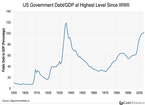 The stats back up Dalio’s view. In the United States, government debt as a percentage of gross domestic product (GDP) is 102%...its highest level since World War II.
