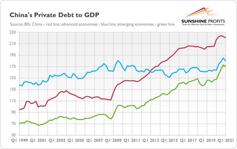 However, gold bulls could warmly welcome my answer to the second question: the case of Evergrande reveals deep and structural problems of China’s economy, namely its heavy reliance on debt and the real estate sector. As the chart below shows, the debt of the private non-financial sector has increased from about 145% of GDP after the Great Recession to 220% in the first quarter of 2021.