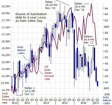 Automakers also are raising incentives a bit to keep sales moving. However, traders weren't fooled. The S&P automotive retail index is already down 7.5% year to date in anticipation of tougher times ahead for the auto-sector. Shares of CarMax (KMX) are already 18% below the February highs. Auto-Nation; the US's #1 car dealer, has taken the brunt of the selling. It's plunged38% since the start of 2016, sliding to its lowest level in four years.