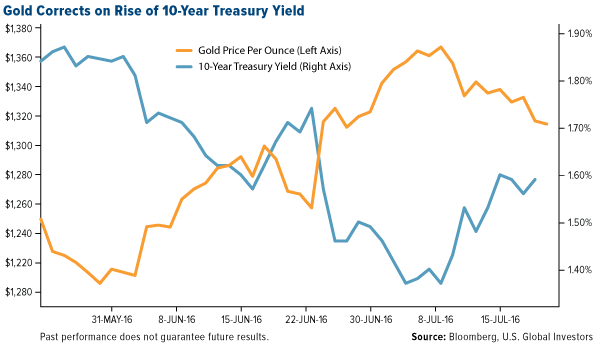 More so than the upcoming election, gold prices are being driven by U.S. dollar action, interest rates and low-to-negative bond yields around the world. (Between $11 trillion and $13 trillion worth of global sovereign debt currently carries a negative yield.) Right now the yellow metal is in correction mode on a strengthening dollar and rising two-year and 10-year Treasury yields, both of which share an inverse relationship with gold.