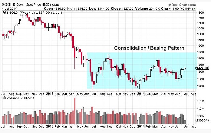 Gold prices have been in a giant basing or consolidation pattern for more than one year. As can clearly be seen below, gold futures prices have traded in a range between roughly 1,175 and 1,430 since June of 2013.