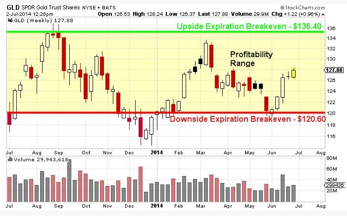 The strategy is called an Iron Condor Strategy, however in order to make this trade worth while we would consider widening out the strikes to increase our profitability while simultaneously increasing our overall risk per spread. Consider the chart of GLD below which has highlighted the price range that would be profitable to the August monthly option expiration on August 15th.